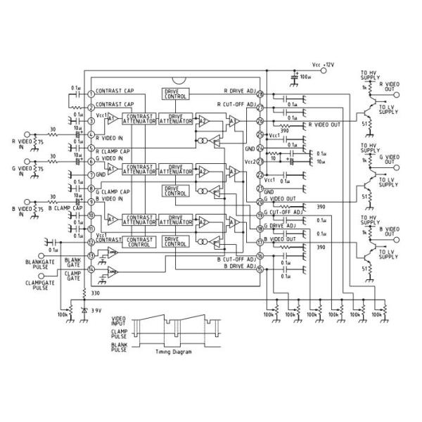MM1207 is a wideband video amps system developed for use in high resolution RGB monitors. In addition to three matched video amps, it has a gate controlled differential input black level comparator for luminance adjustment, three matched DC control attenuators for contrast adjustment, and three gain trimming CD control subcontrast attentuators for white balance. All DC control input is high impedance, and the operating range is set for easy interface with serial bus control systems, at 0~4V. Also, MM1207's built-in blanking circuit clamps video output to between GND~0.1V during blanking, enabling blanking on the CRT cathode.